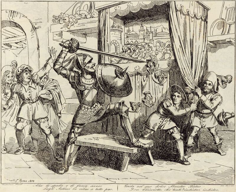 Alza la spada e di furor acceso / Sugli Autómi la vibra a tutto peso. / Grida nel suo dolor Maestro Pietro / Don Chisciotte, che tenti? indietro, indietro.