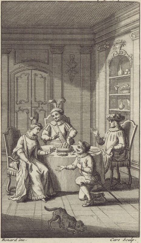 Sancho Panza kneels before the duchess to thank her and the duke for granting him the governorship of Barataria Island. The party are seated around a dining table, on which is pictured some food. A dog is pictured in the foreground. Signed by Bonard (illustrator), no given name, and L. Cars (engraver). Part 2, ch. 32.
