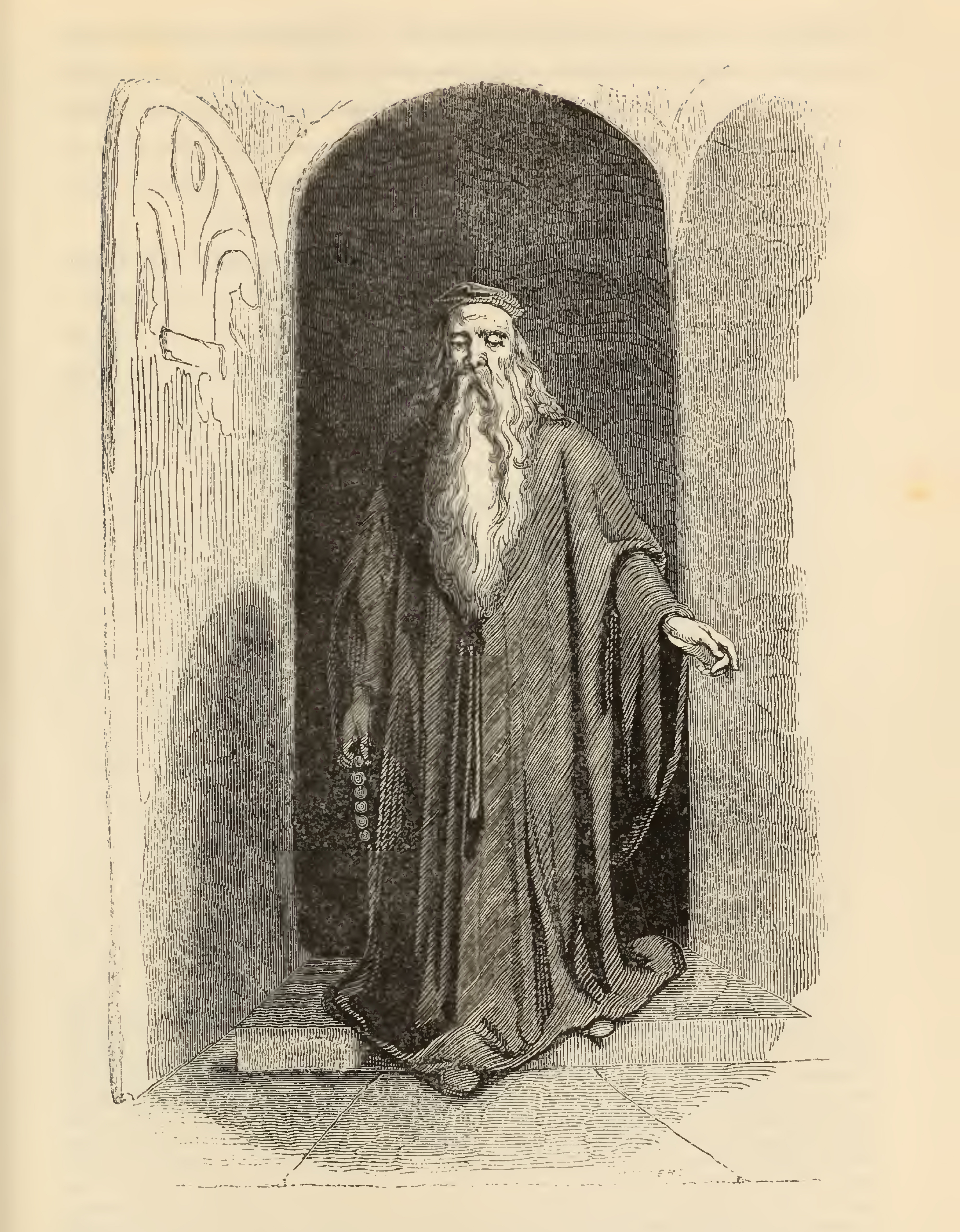 A venerable old man, clad in a long purple mourning cloak, which trailed upon the ground walks forward having opened two great folding doors. Over his head he has ablack Milan, and his beard reaches below his girdle. He carries no weapons, only a rosary of beads in his hand, bigger than middling walnuts.