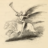 A post-boy, habited like a devil, with horns and decaying wings, rushes by on the back of a white horse, blowing into a monstrous hollow horn as he goes. The image is occasioned by Montesinos allegedly knowing the method to disenchant Dulcinea and sending a post boy to relay his message.