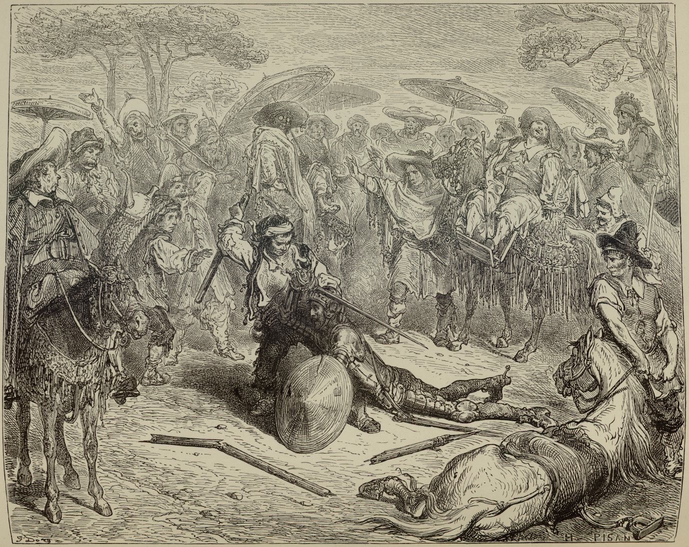 On the road, Don Quixote encounters a group of merchants from Toledo on their way to Murcia to buy silk. Cervantes writes that there are six of them, holding parasols, four servants on horseback, and three grooms on foot leading mules. Don Quixote orders them to halt and to confess that there is no woman more beautiful than Dulcinea of Toboso. When they refuse, the knight charges them but falls from his mount. One of the grooms breaks Don Quixote’s lance and Signed by G. Doré (illustrator) and H.-J. Pisan (engraver). Part 1, ch. 4.