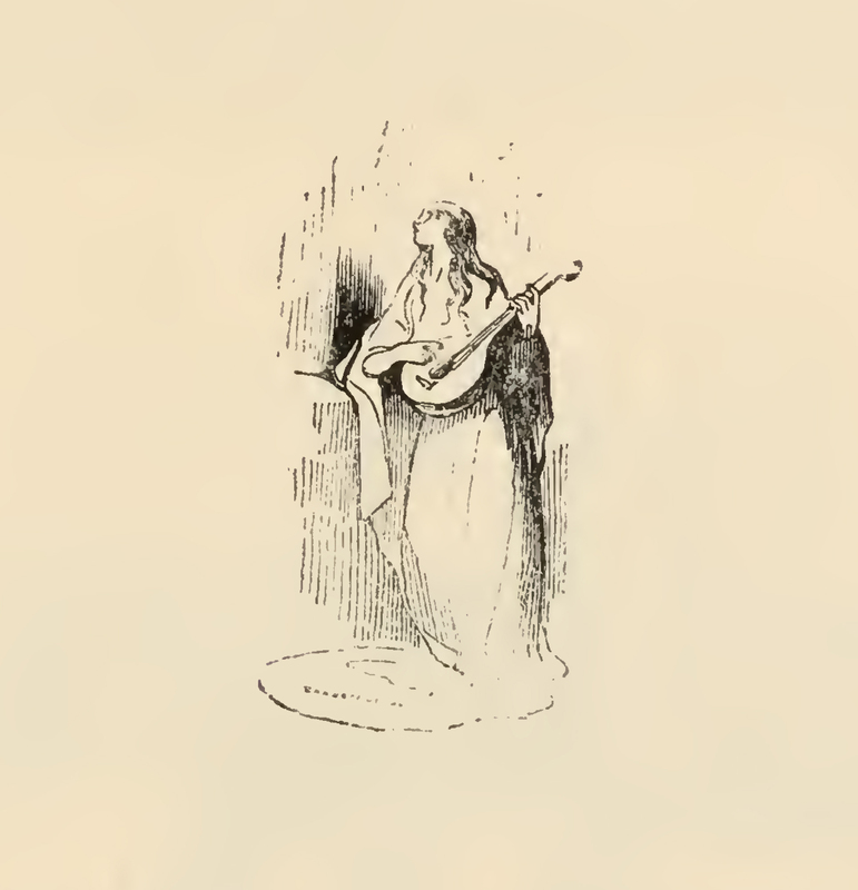 - A young woman dressed in a white dress with long hair holds a lute which she plays while looking off into the night sky on the left. The image is occasioned by Altisidora courting Quixote from the duchess' garden.