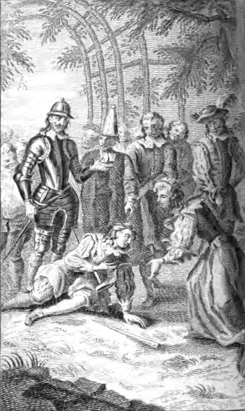 Don Quixote and Sancho Panza attend the wedding of Quiteria the fair and Camacho the rich. The ceremony is interrupted by a man clad in a black jacket welted with crimson flames, holding in his right hand a great truncheon who many recognize as the gallant Basilius. At length Basilius planted himself before Quiteria and leaned upon his truncheon which had a steel pike on its end, making it seem as if he has thrown himself upon the edge. In his 'dying' breaths he tells Quiteria that he will not confess himself to God unless she marries him him. Quiteria has no desire to give Basilius her hand in marriage, but many of the guests beg her to grant his request including the priest. Hesitantly Quiteria approaches Basilius, kneels by his side and gives says she will be his lawfully wedded wife. Upon hearing these words Basilius gives up the act.