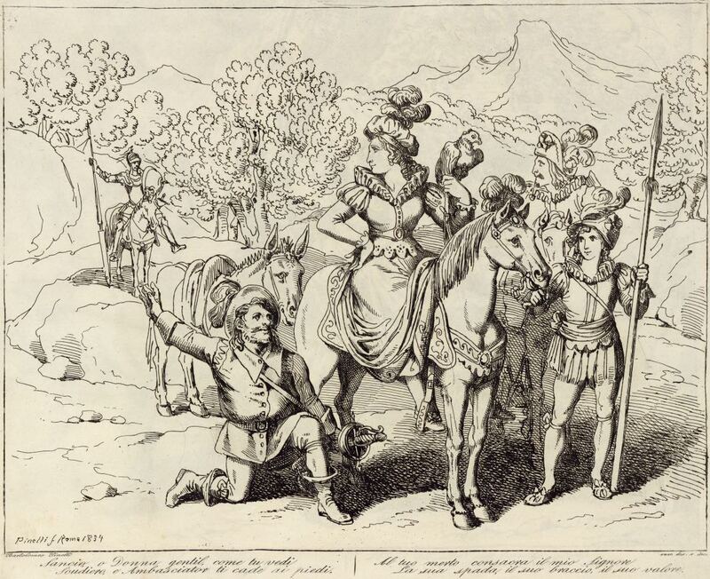 Sancho Panza, kneeling before the duchess and her squire, introduces her to Don Quixote, who waits in the background. The duchess is pictured on horseback and holds a goshawk. Signed by Bartolomeo Pinelli (engraver and illustrator) and dated Rome, 1833. Plate 52. Part 2, ch. 30.