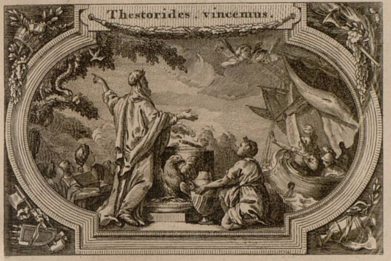 This image appears at the beginning of the twelfth book. It depicts a scene of the seer Calchas making a sacrifice and interpreting signs to determine that the Greeks will win the war against the Trojans in the Trojan War. There is a snake and a bird in the top left corner of the image which are some of the signs that Calchas interpreted about the war. Calchas is depicted standing in front of a fire which was lit to honour the god Zeus (Jupiter). The ship on the right side of the image represents the Greeks leaving for their journey to Troy.
