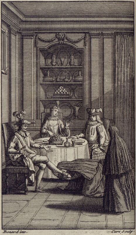 Doña Rodríguez kneels before Don Quixote to kiss his foot. She begs him to help her daughter. Both are dressed in black, in mourning. The duke and the duchess, also seated at the table, look on. Signed by Bonard (illustrator), no given name, and L. Cars (engraver). Part 2, ch. 52.