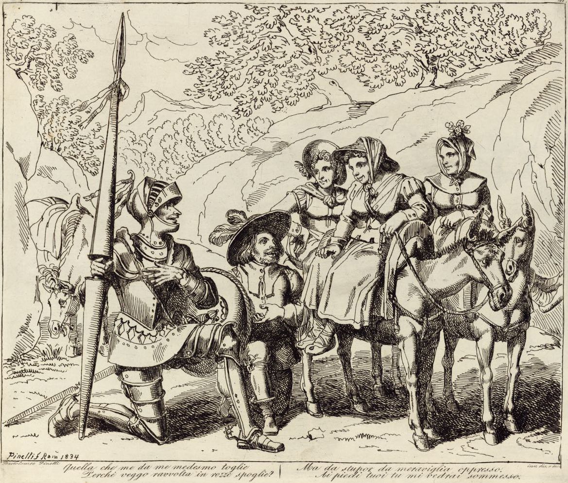 Don Quixote and Sancho Panza kneel before three peasant girls mounted on donkeys. Sancho introduces one of them as the enchanted Dulcinea and Don Quixote tries to kiss her foot. Signed by Bartolomeo Pinelli (engraver and illustrator) and dated Rome, 1833. Plate 41. Part 2, ch. 10.