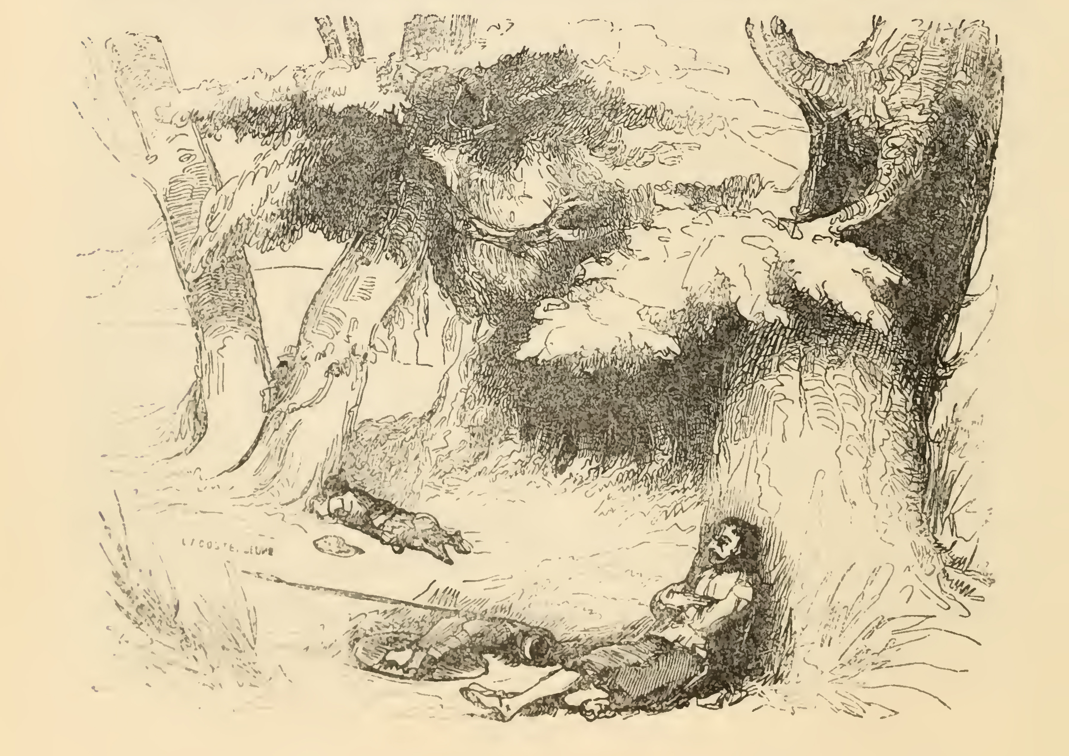 In the midst of a grove, Don Quixote (right) accommodates himself at the foot of an elm, and Sancho face first at the foot of a beech, seeking a position to least renew the pain of his bruises. Don Quixote crosses his arms and spreads out his legs, spending his time it in meditations, with his shield and spear by his side.