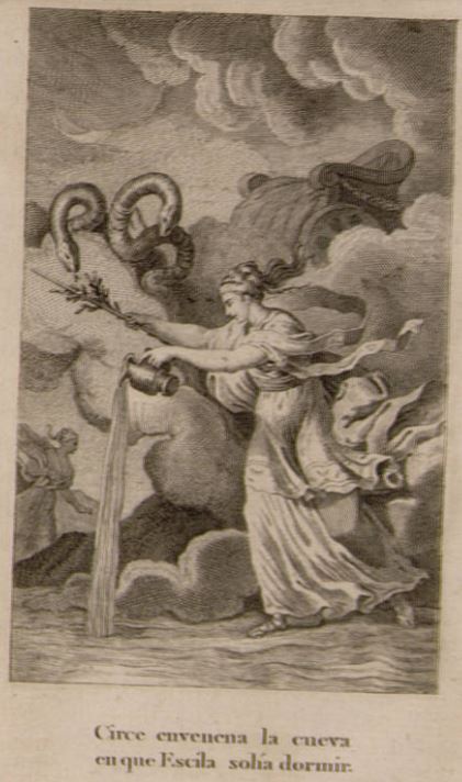 This image depicts the enchantress Circe poisoning a pool of water intended for the nymph Scylla. A sea-God named Glaucus had fallen in love with the beautiful Scylla and asked Circe for her help to get her to love him back. Circe was jealous of Scylla because she loved Glaucus. Instead of helping Glaucus, she let her jealousy overcome her. She poured a poison into a pool of water that was dear to Scylla. Circe is depicted pouring liquid from an amphora into the water with her left hand while she holds magical herbs in her right. Her chariot and snakes are floating on a bed of clouds behind her. Scylla is depicted in the background in her human form before she gets transformed into a monster from the poisonous water.