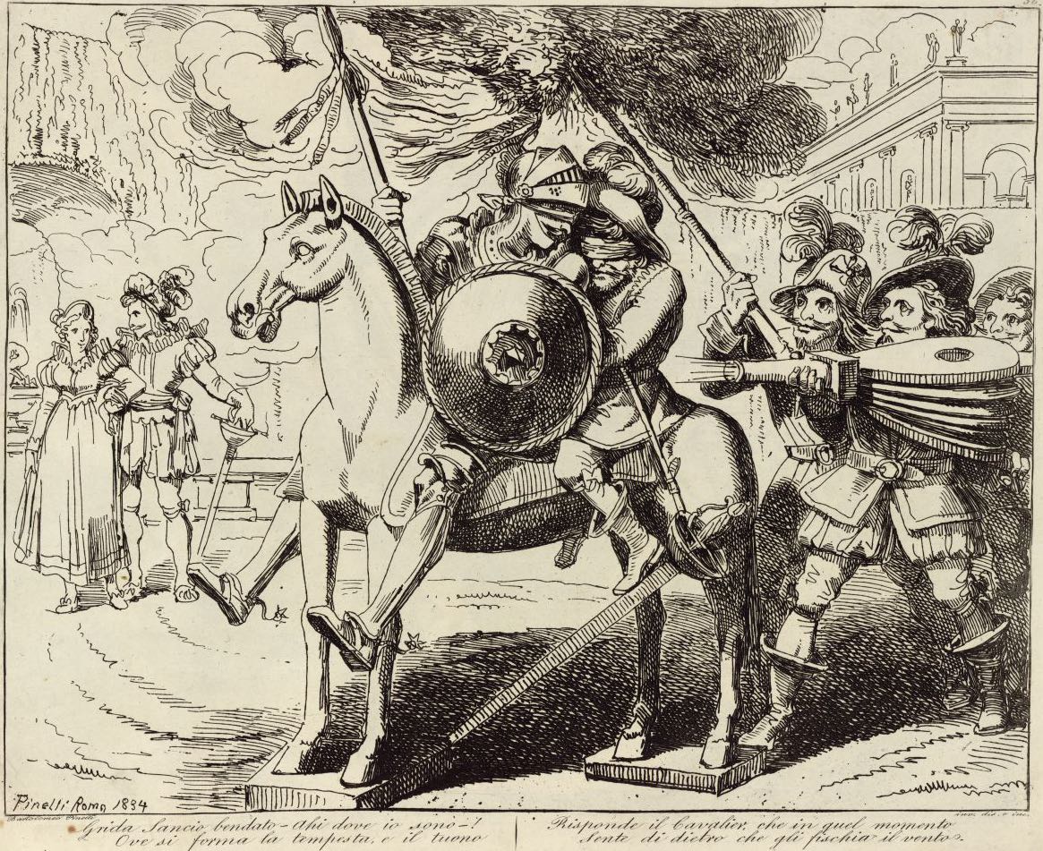 Don Quixote and Sancho Panza, both blindfolded, mount Clavileño while the duchess and duke’s servants simulate its flight with bellows and torches. Signed by Bartolomeo Pinelli (engraver and illustrator) and dated Rome, 1833. Plate 56. Part 2, ch. 41.