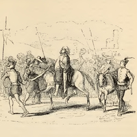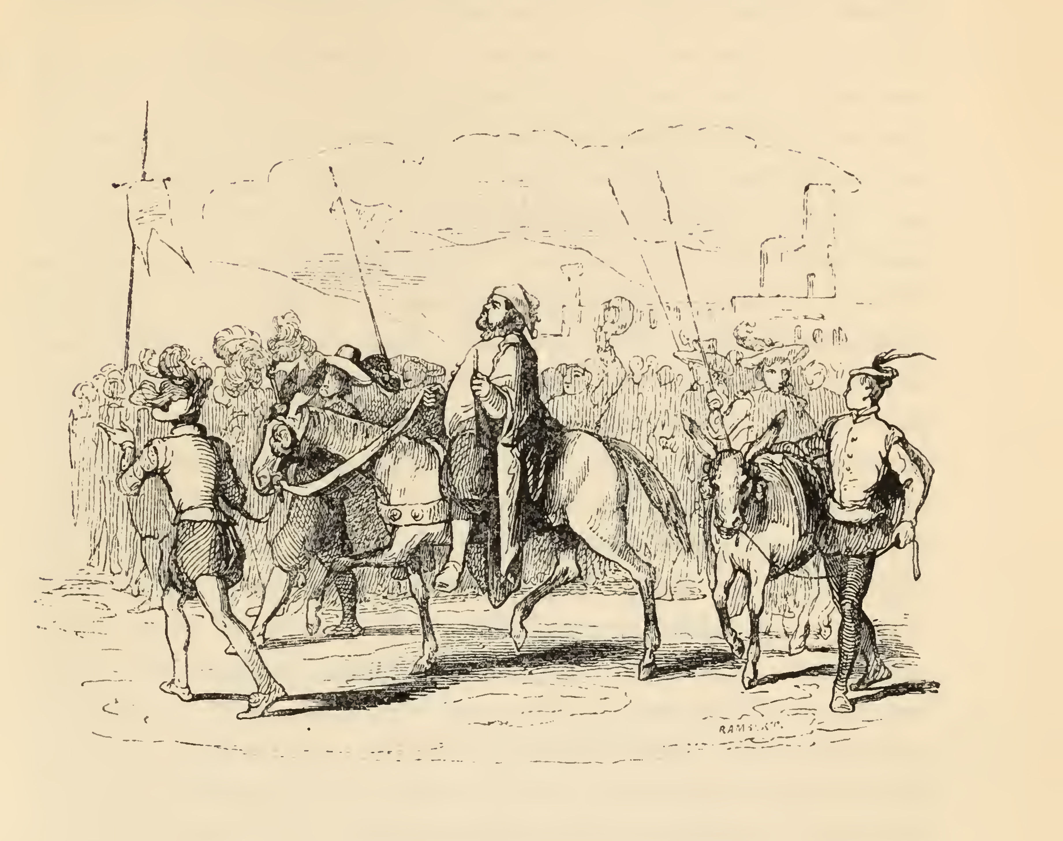 Sancho sets out with a great number of followers holding banners, the squire dressed like a magistrate, having on a wide surtout of murrey coloured camlet, and is mounted upon a mule. On the right is led his donkey, Dapple, with a new harness decorated with ribbons. Both creatures are led at the bridle by pages.