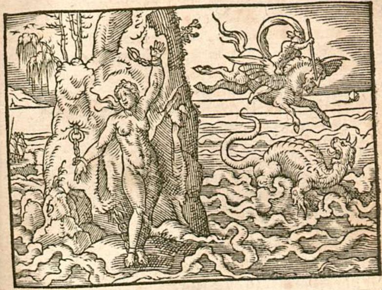 This image illustrates Andromeda, the daughter of King Cephus, chained to a rock in the sea. Andromeda was placed here to pay the penalty for something her mother had said. Perseus had been flying in the sky when spotted the beauty of Andromeda. Perseus asked Andromeda who she was and where she came from, but before she could finish speaking, a serpent had emerged from the sea. Andromeda’s parents agreed that they would allow Perseus to take Andromeda’s hand in marriage in exchange for killing the serpent and saving their daughter. Perseus flew to battle and slayed the monster, freeing Andromeda and taking her hand in marriage.