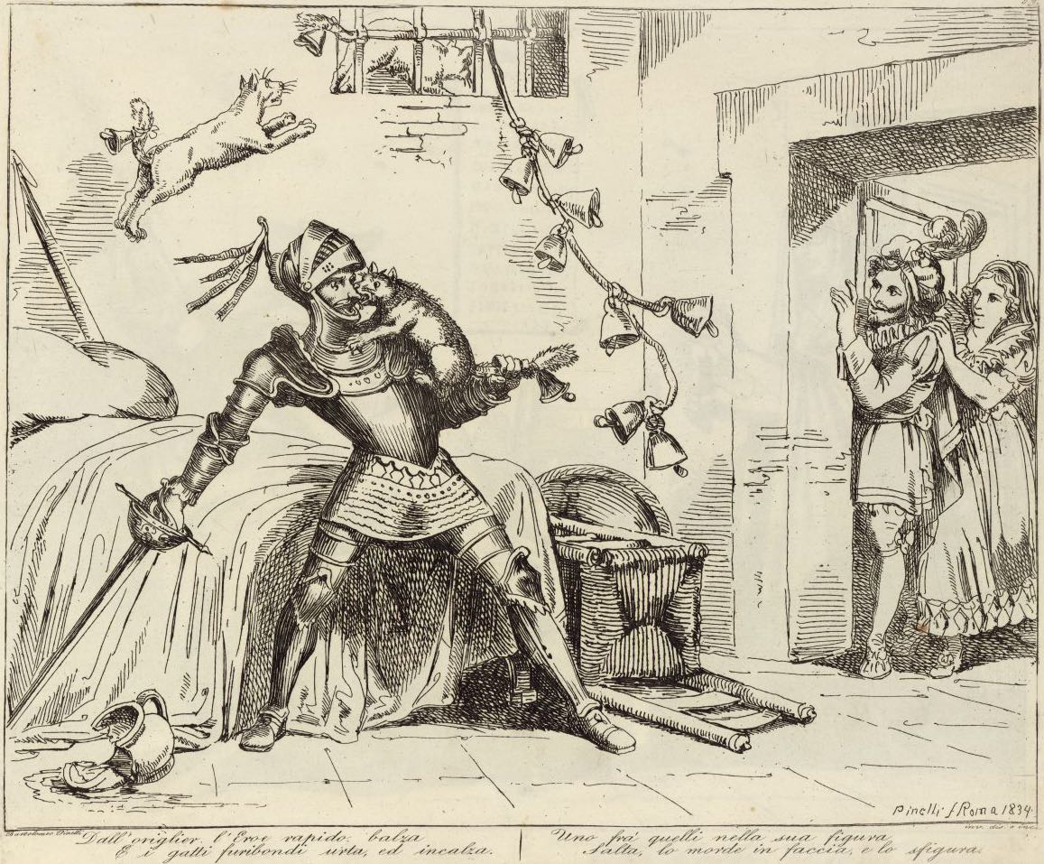 From a gallery above Don Quixote’s window, a cord with more than a hundred cowbells attached is lowered, followed by a sack full of cats, with smaller bells attached to their tails. Some of the cats make their way into Don Quixote’s room via the window and are mistaken by the knight for enchanters or wizards. He attacks them and manages to scare most of them off, but one cat is so hounded by Don Quixote’s sword thrusts that he claws at the knight’s face. Signed by Bartolomeo Pinelli (engraver and illustrator) and dated Rome, 1833. Plate 59. Part 2, ch. 46.