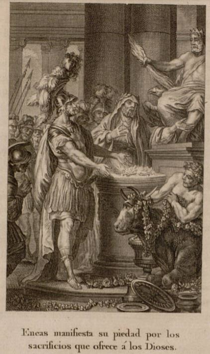 Eneas manifiesta su piedad por los sacrificios que ofrece a los Dioses