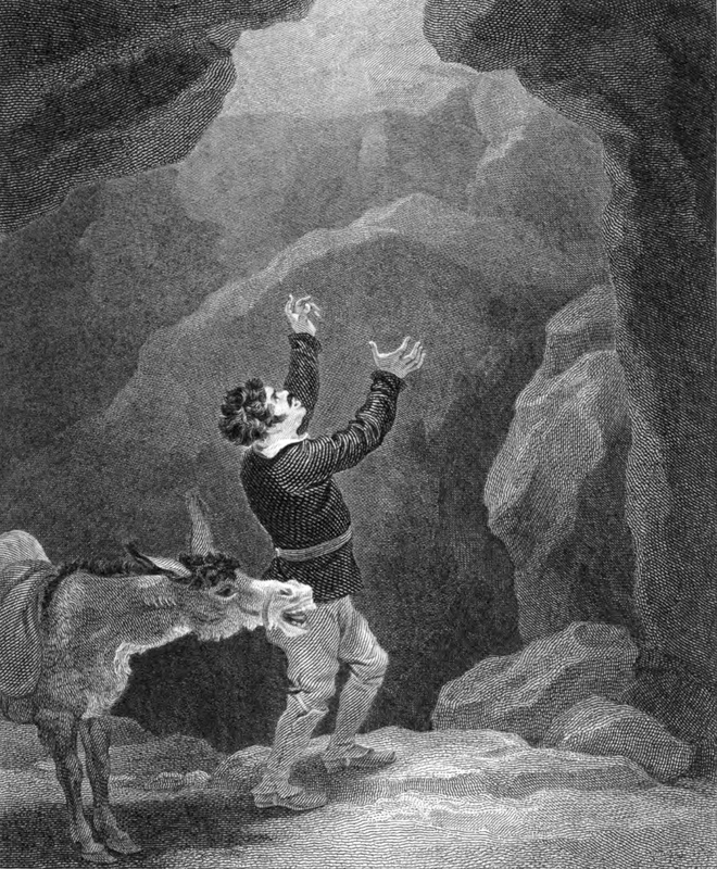Having sought a convenient shelter for the night, Sancho Panza and Dapple fell together into a cavity, among the ruins of an old building. Lamenting and despairing in the pit, which was half a league, he perceived a kind of glimmering light, breaking through some aperture above, that seemed to him an entrance to the other world. And so Sancho stands among the rock walls of the pit, looking up towards the light with his arms upraised. Dapple, his donkey, is behind him.