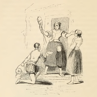 Having ridden from the duchess' estate, a page (left) falls to a knee and taking off his hat offers a letter to Teresa Panza (middle). The woman in the middle (Teresa) comes out from her house spinning a distaff full of tow, she is dressed in a short grey petticoat, with a grey boddice, and her smock-sleeves hanging about. On the right, a young girl in bare feet (Sancho's daughter) clasps her hands together and looks towards the page.
