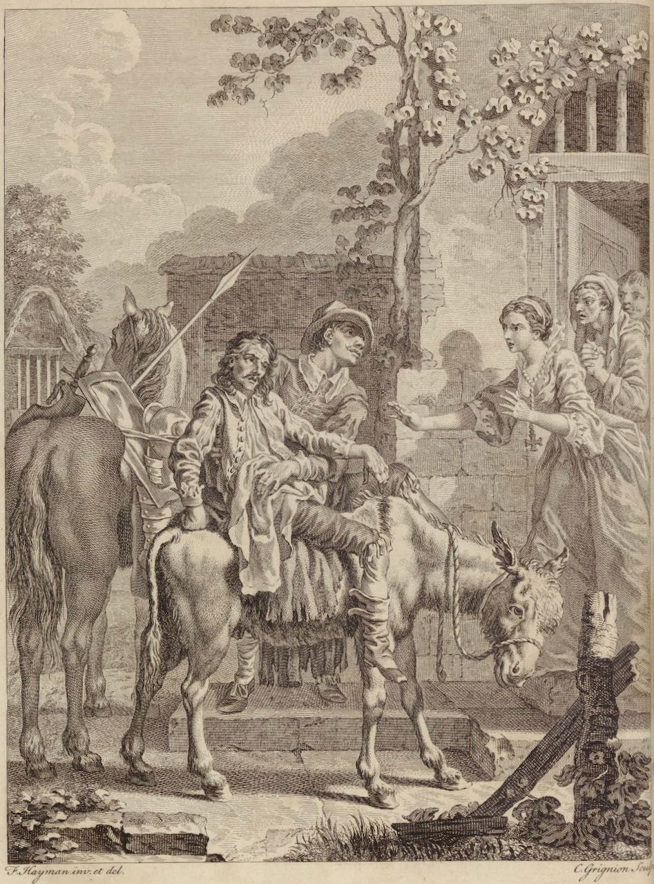 Don Quixote returns home from his first sally, on Pedro Alonso’s mule. Rocinante carries Don Quixote’s shield, lance, and armour. The housekeeper, the niece, and another character (either the priest or the barber) are pictured in the doorway, receiving the travellers. Signed by F. Hayman (illustrator) and C. Grignion I (engraver). Part 1, ch. 5.