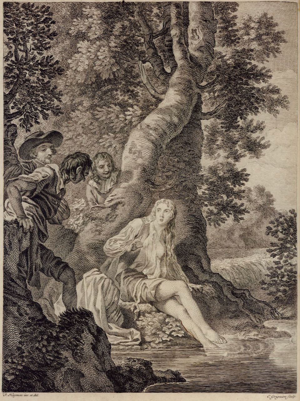 The priest, the barber, and Cardenio encounter Dorotea, washing her feet in a stream. The trees and shrubbery pictured in the illustration are well detailed. Signed by F. Hayman (illustrator) and C. Grignion I (engraver). Part 1, ch. 28.