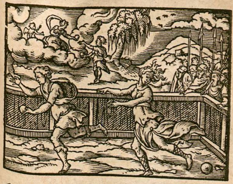 This engraving illustrates the footrace between Atalanta and Hippomenes. Atalanta was an incredibly fast runner and could beat any man who challenged her. She decided that she would host a running contest. The man to beat her in a race would win her as a prize, and whoever lost against her would die. A man named Hippomenes decided to race her, as he was taken with her beauty and athletic abilities. He prayed to the goddess Venus for help. Venus is illustrated in the background of the engraving coming out of the sky and handing golden apples to Hippomenes. The race is taking place in the fore-front of the engraving, with Hippomenes in first place. He uses the apples that Venus had given him to distract Atalanta. She is depicted running with her head turned looking at the apples that Hippomenes is throwing, causing her to slow down and come in second place.