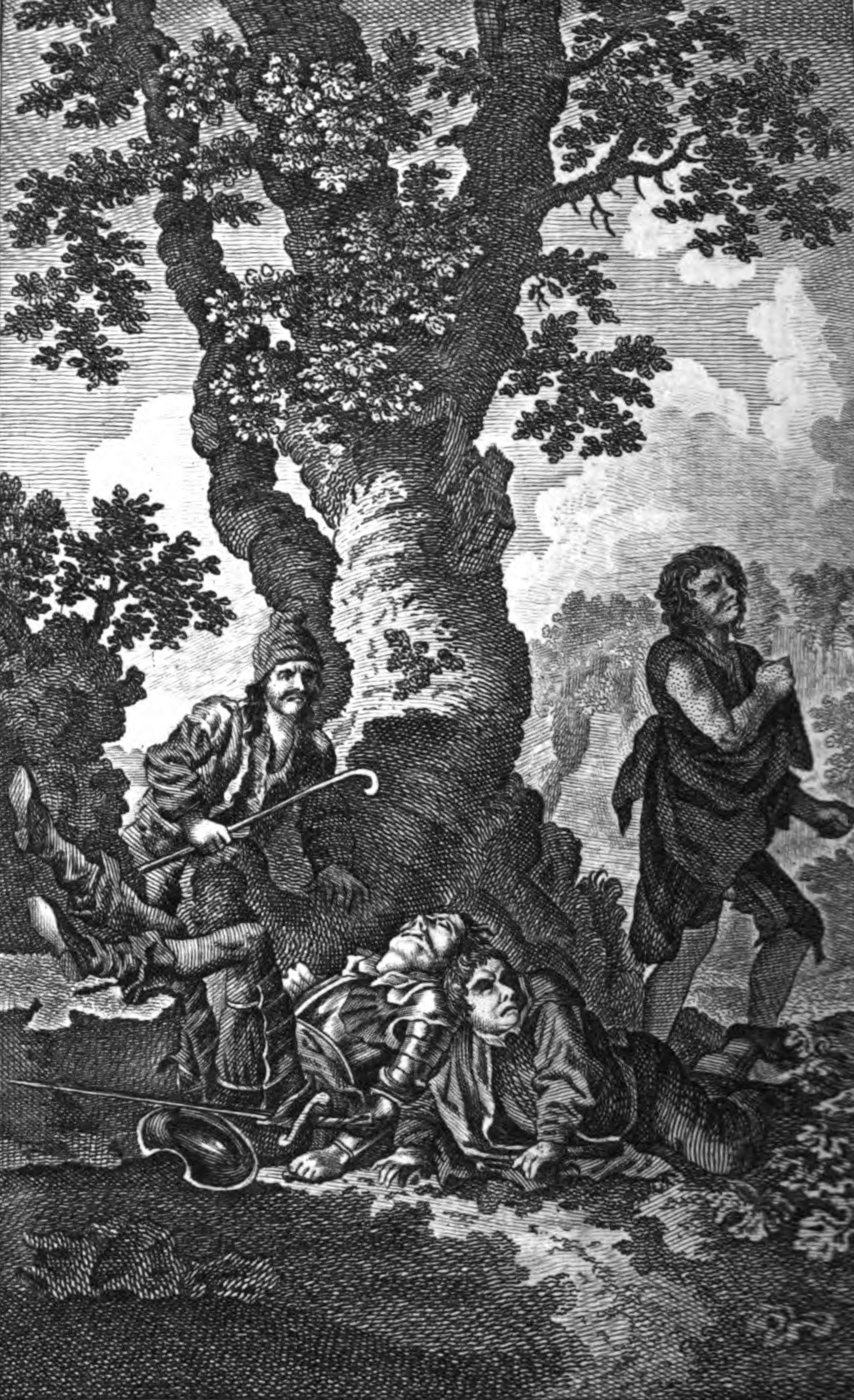After being interrupted by Quixote and subsequently being called both a liar and a scoundrel, Cardenio is overcome by a fit of a madness. In his madness, Cardenio, snatched up a stone and threw it at Don Quixote's breast with such force that it laid him on his back. Unwilling to let this offence go unpunished, Sancho Panza tried to fight Cardenio but was quickly knocked off his feet and pummeled to Cardenio's satisfaction. Once satisfied, Cardenio returned to his spot in the mountains. Sancho Panza can be seen eyeing Cardenio murderously, as Cardenio walks off indignantly. To Sancho's left, Quixote lies unconscious beneath the tree, while the shepherd who introduced Cardenio to Quixote looks over worriedly to Sancho Panza, afraid that Sancho will direct his anger on him.