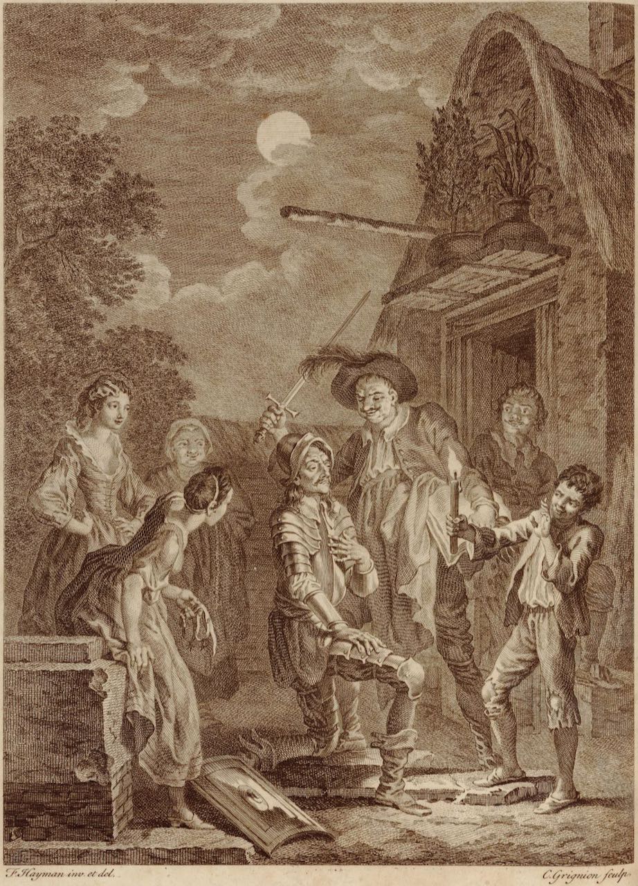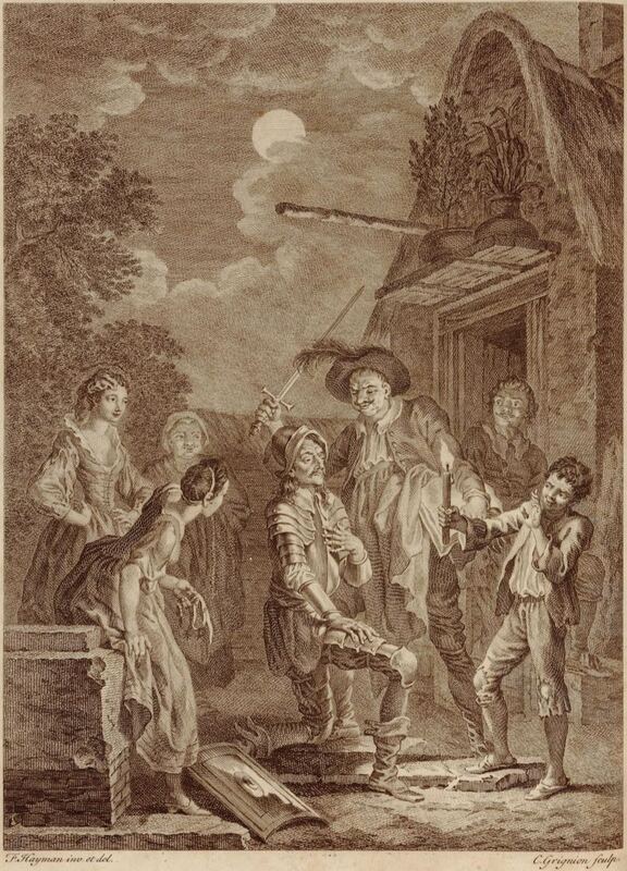 The innkeeper, with sword and book in hand, knights Don Quixote, who kneels before him. Don Quixote wears his armour. Doña Molinera and Doña Tolosa stand to the left, while a boy holding a candle is depicted to the right. Two more figures, who do not appear in Cervantes’ text, watch the proceedings. In the background, the inn, with a thatched roof and stone walls. The scene is accurately depicted at night: the characters are illuminated by the light of the boy’s candle and that of the moon. Signed by F. Hayman (illustrator) and C. Grignion I (engraver). Part 1, ch. 3.