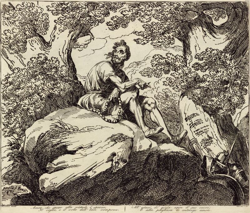 In Sierra Morena, Don Quixote and Sancho Panza arrive at the foot of a high mountain, standing alone among the many others that surround it. Don Quixote chooses this place for his penance. He inscribes verses for Dulcinea into the tree trunks, and prays with his makeshift rosary, fashioned by tying eleven knots in a strip of cloth torn from his shirt. He has removed his armour, for he must be as naked as the day he was born if he is to follow Roland. Signed by Bartolomeo Pinelli (engraver and illustrator) and dated Rome, 1833. Plate 28. Part 1, ch. 26.