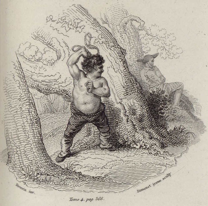 Sancho Panza pretends to give himself lashes to disenchant Dulcinea (he whips tree trunks), while Don Quixote counts the lashes. Signed by A J.-J.-M. Devéria (illustrator) and A. J. Simonet, jeune (engraver). Part 2, ch. 71.