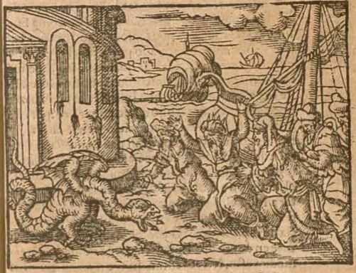 This engraving depicts the god of healing, Aesculapius, transformed in the form of a winged snake. He is illustrated just outside of his own temple. There are men standing in front of Aesculapius who appear to be extremely afraid of the snake. These men, as told by Ovid, are Romans who sought the help of Aesculapius as their city was ravaged by the plague. Aesculapius had appeared to one of these Roman delegates in his dream to inform him that he would help their city and accompany them back to Rome on their ships in the form of a serpent.