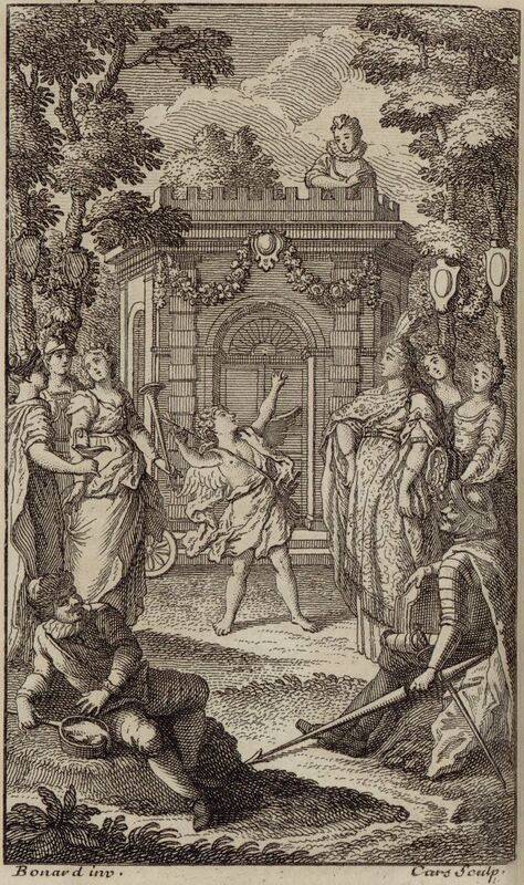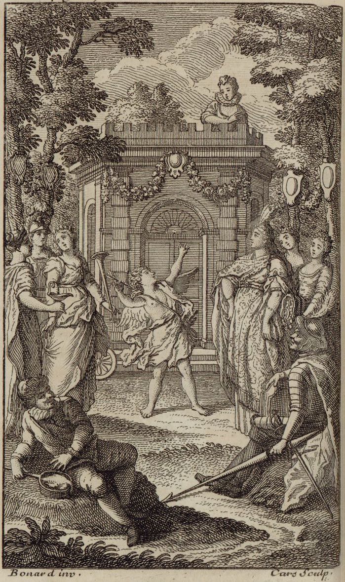 In the centre of the composition, the nymph Cupid dances before a wooden castle, while a maiden standing on the parapets watches. Cupid leads four nymphs (three pictured), Poetry, Discretion, Good Lineage, and Valor (left). To the right, the nymph Interest leads Liberality, Gifts, Treasure, and Peaceful Ownership. Sancho Panza eats chicken and geese while Don Quixote observes the performance. Signed by Bonard (illustrator), no given name, and L. Cars (engraver). Part 2, ch. 20.