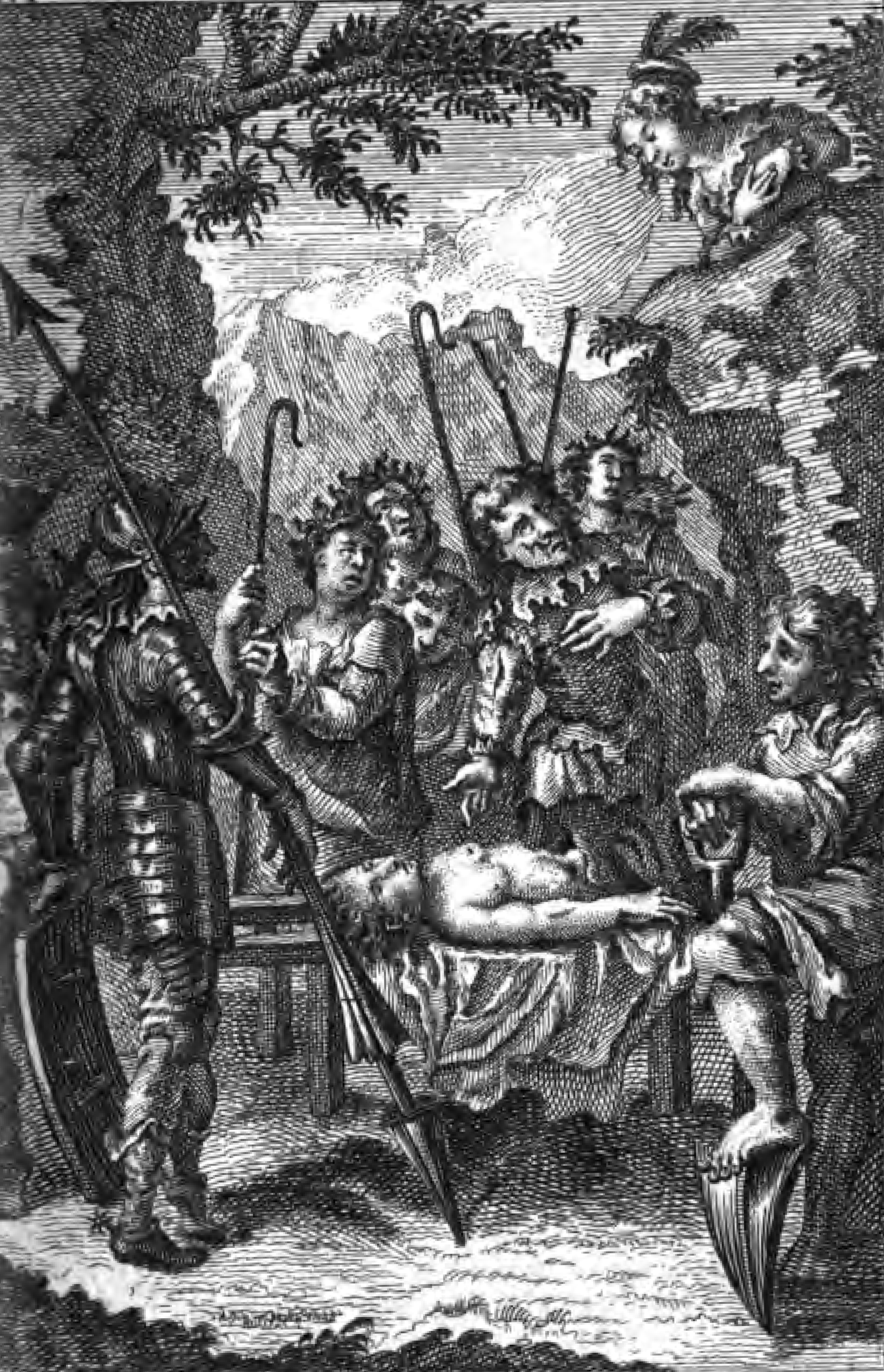 Don Quixote and a party of Shepherds attend the burial of Chrysostom, a shepherd who had fallen so deeply in love with Marcela, a shepherdess who refuses to marry, that he killed himself when he was rejected. At the burial Vivaldo (middle right), a passing scholar/gentleman (hidalgo), reads aloud one of Chrysostom's poems written in Marcela's absence to the approval of those who heard it. Vivaldo is about to read another one of Chrysostom's poems, but he is interrupted by Marcela who appears on top of the rock under which they are digging Chrysostom's grave. Ambrosio (left of Vivaldo), Chrysostom's closest friend, accuses Marcela of killing Chrysostom and asks why she has bothered to appear at her victims burial. She responds that she has returned to vindicate herself of the deed which she has been accused of. Don Quixote watches these events unfold clad in full armor, leaning passively upon his shield.