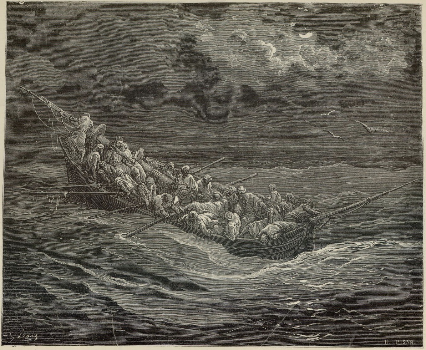 The illustration represents part of the captive’s tale: the captive and Zoraida escape in a boat, holding captive Agi Morato and the Moor oarsmen. They begin to row toward the islands of Mallorca, the closest Christian land. Signed by G. Doré (illustrator) and H.-J. Pisan (engraver). Part 1, ch. 41.
