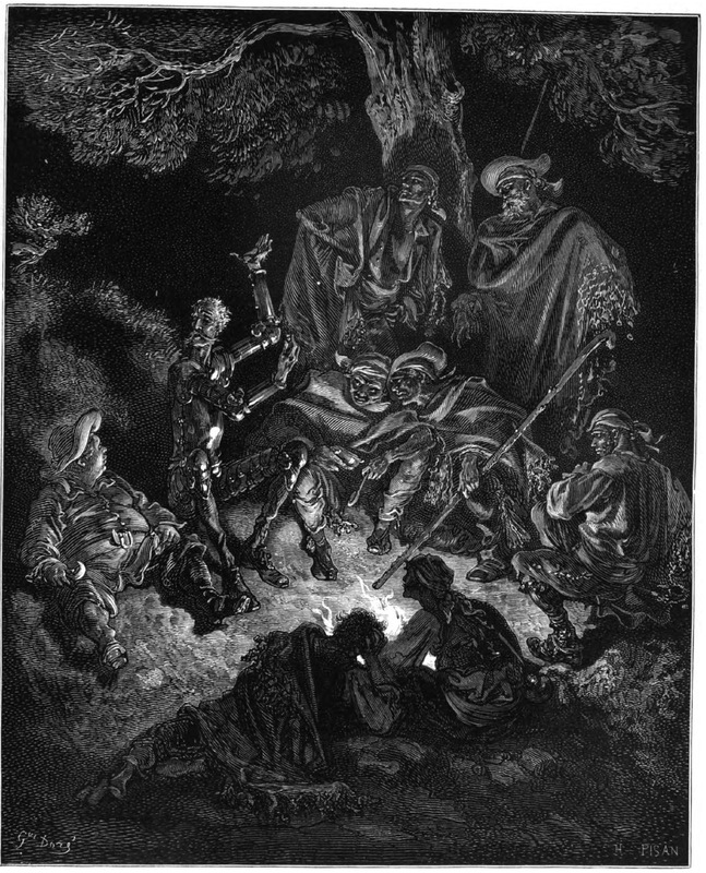 Don Quixote and Sancho Panza are hosted by a group of goatherds for dinner. Don Quixote, upon seeing some acorns offered as part of the meal, begins a long tangent about the golden age of nights-errant of which the acorns remind him. He concludes this by thanking the goatherds for their hospitality. The goatherds are confused and amazed by this long speech and offer music as entertainment and a balm to heal Don Quixote’s ear. Don Quixote and Sancho Panza are seated on overturned trough. Don Quixote is telling his story with his arms raised. The goatherds are gathered around the fire, some lying down, some seated, and some standing, watching Don Quixote attentively. This scene can be found in Part I, Book 2, Chapter 3.