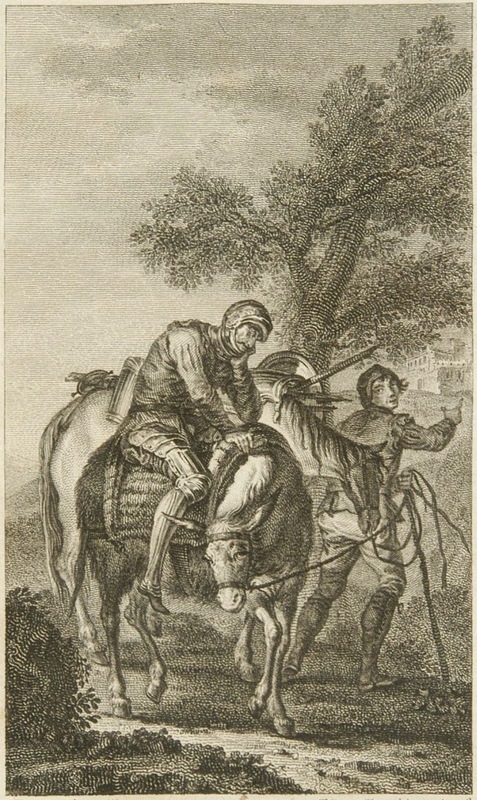 A local farmer, Pedro Alonso, rescues Don Quixote after his encounter with the silk merchants of Toledo and takes him home on his mule. Rocinante carries Don Quixote’s armour and broken lance. The knight appears melancholic. Signed by J. Rivelles (illustrator) and T. L. Enguídanos (engraver). Part 1, ch. 5.