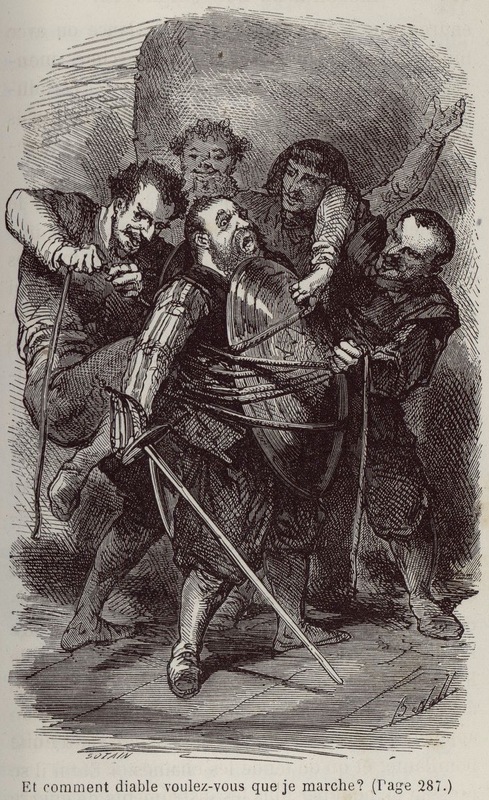 During the invasion of Barataria Island, soldiers tie Sancho Panza between two shields to protect him. In protest, he asks them how they expect him to walk. Signed by A. d’Arnoux (illustrator) and N. E. Sotain (engraver). Part 2, ch. 53.
