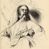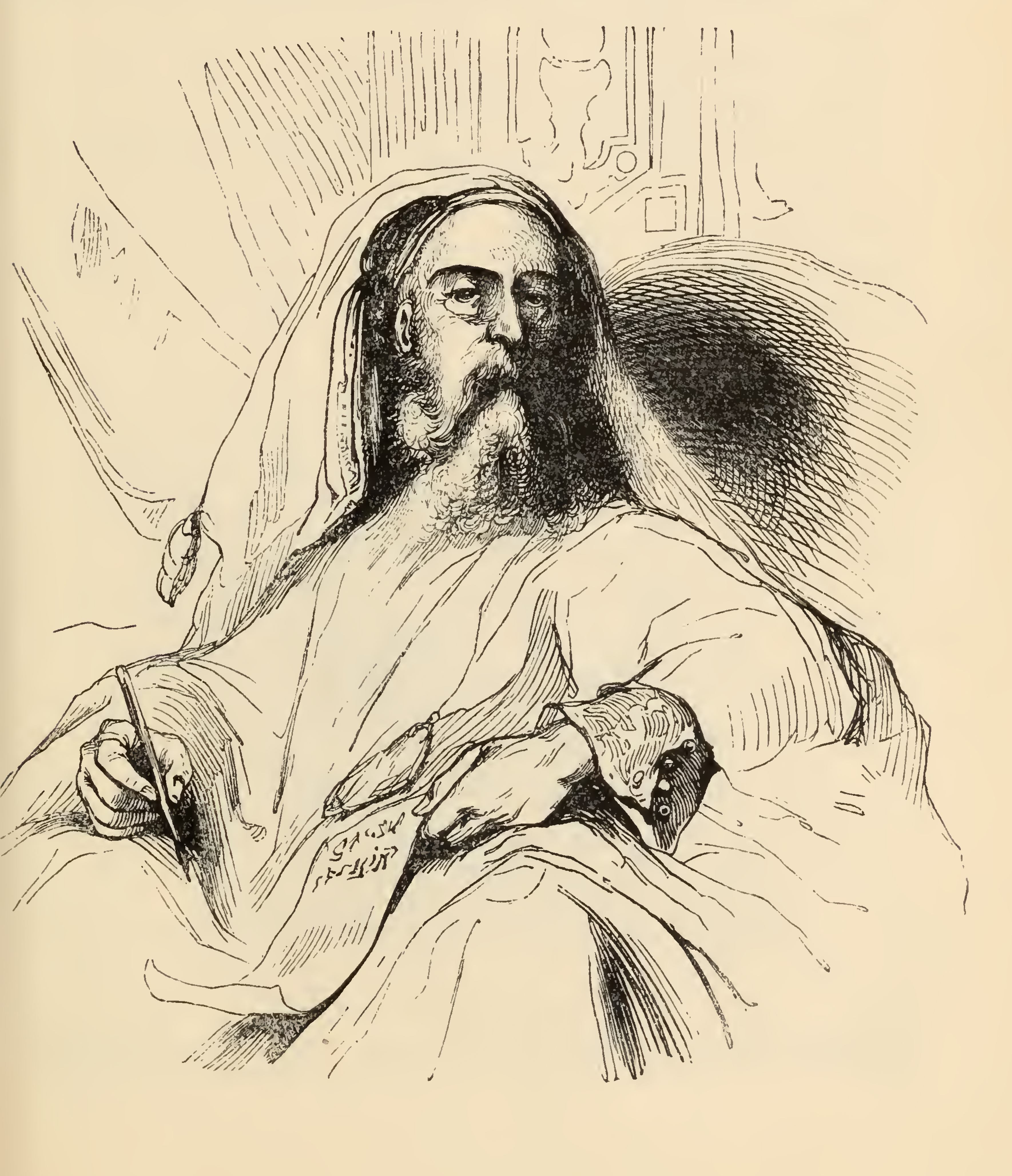 An old man sits in a chair in white robes and buttoned shirt with white cloth draped back over his head, an illustrious beard and moustache to his name and a necklace set with a heavy stone slung across his shoulder. In his right hand he holds a quill and in his left a piece of paper which he has already begun drawing symbols upon from the bottom upwards. The image is occasioned by Don Quixote saying that "the author of this our history must be some sage enchanter. Nothing is hidden from those gentry that they have a mind to write."