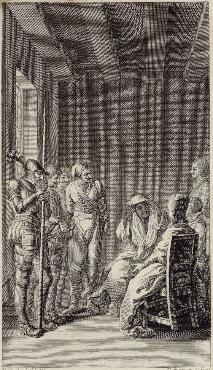 At the inn, Zoraida and the captive introduce themselves to the guests: Don Quixote, Don Fernando, Cardenio, Dorotea, Luscinda, and the barber. The illustration is not accurate to the text: Zoraida is depicted as a black woman. Signed by D.-N. Chodowiecki (illustrator) and D. Berger (engraver), dated 1779. Plate 7. Part 1, ch. 37.