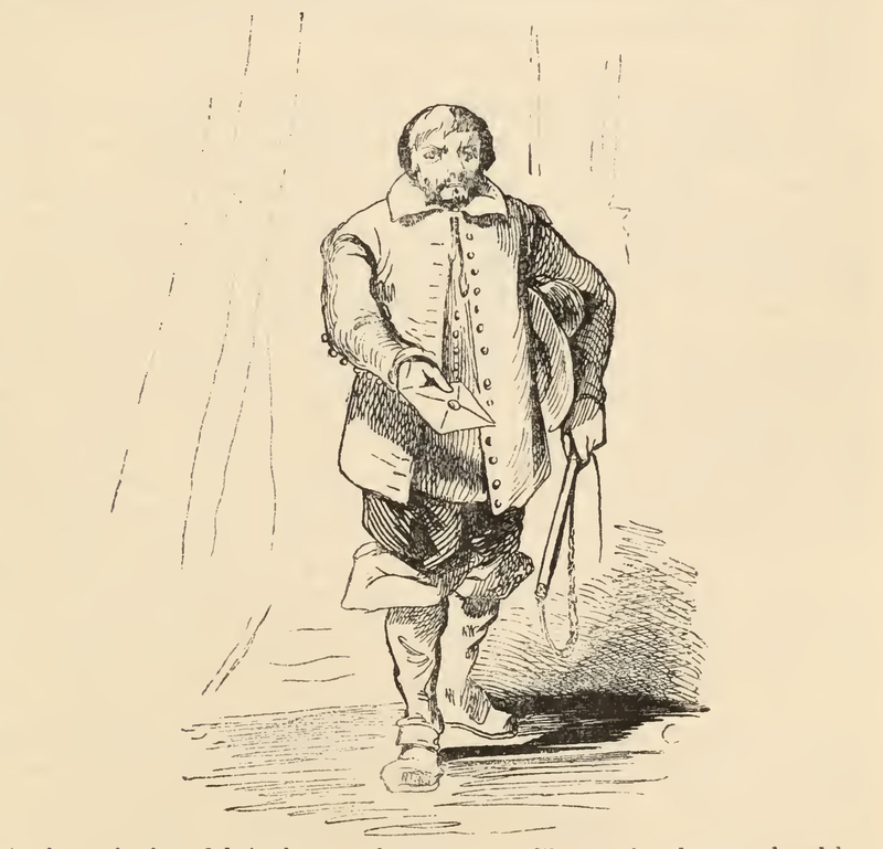 A courier enters out of breath and extends out a letter in his right hand, in his left hand he holds a horse whip and under his arm a hat. He has arrived to deliver a letter to Sancho Panza on the duke's decree informing him of an upcoming attack on Barataria.