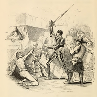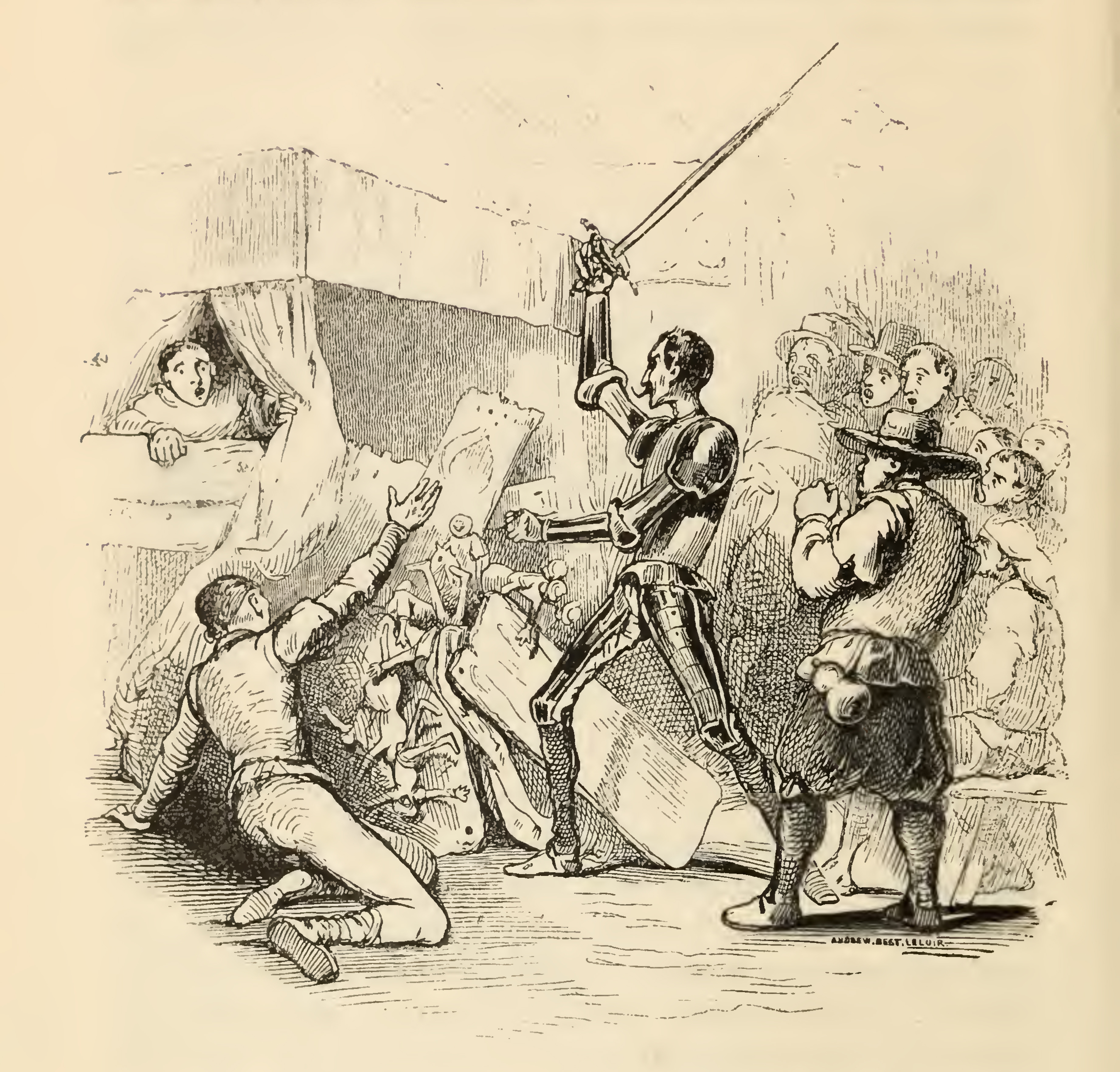 When Don Quixote, clad in armor, saw this cohort of master Peter's Moorish puppets, he he rose from his seat, unsheathed his sword, and, began to rain hacks and slashes upon the puppets, showering down strokes like hail and demolishing the castelet. The whole audience appears to be in consternation, and even Sancho (right) steps backwards having never seen his master so outraged. Master Peter lies on the ground next to his castelet reaching out to Quixote and begging him to cease in his destruction, while a young boy on the left peels back a curtain and watches Quixote destroy the puppets in horror.
