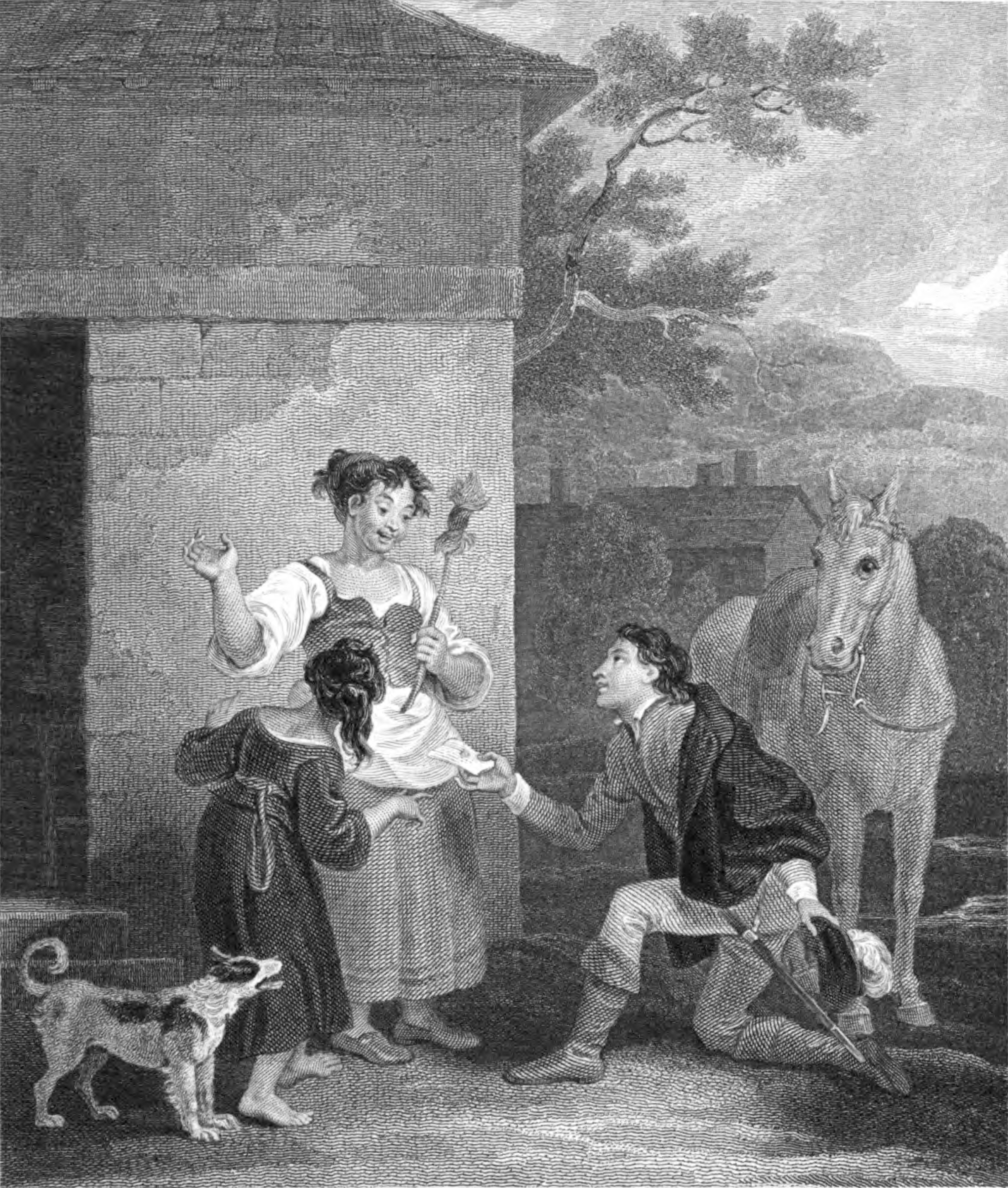 The page of the duchess kneels before Teresa Panza who holds a tow ball that she had been spinning, and hands Sancho's letter to her. Sanchica, Sancho's daughter, stands barefoot next to her mother, looking at the letter in surprise. A dog stands by Sanchica's feet and a horse behind the Page.
