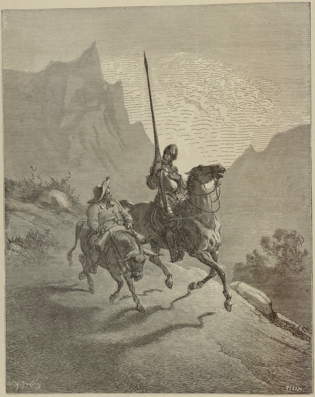 - Don Quixote and Sancho Panza set out on a second sally (Sancho’s first). Signed by G. Doré (illustrator) and H.-J. Pisan (engraver). Part 1, ch. 7.