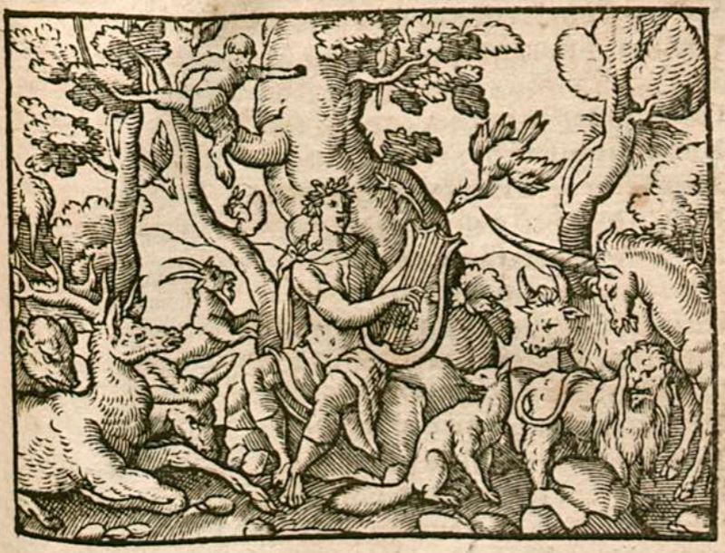 The scene that this engraving depicts takes place just after Orpheus had tried rescuing his wife, Eurydice, from the Underworld. Orpheus was meant to travel out of the Underworld without looking back to check that Eurydice was following him. He did, however, look back at Eurydice and she vanished, never to return from death. Grieved by his mistake, and angered with the Gods, Orpheus finds himself on the side of Mount Rhodope where he spent three years singing and playing his lyre for the animals and trees to enjoy. The engraving illustrates the many types of animals and trees flocking to hear the sound of Orpheus’ soulful music.