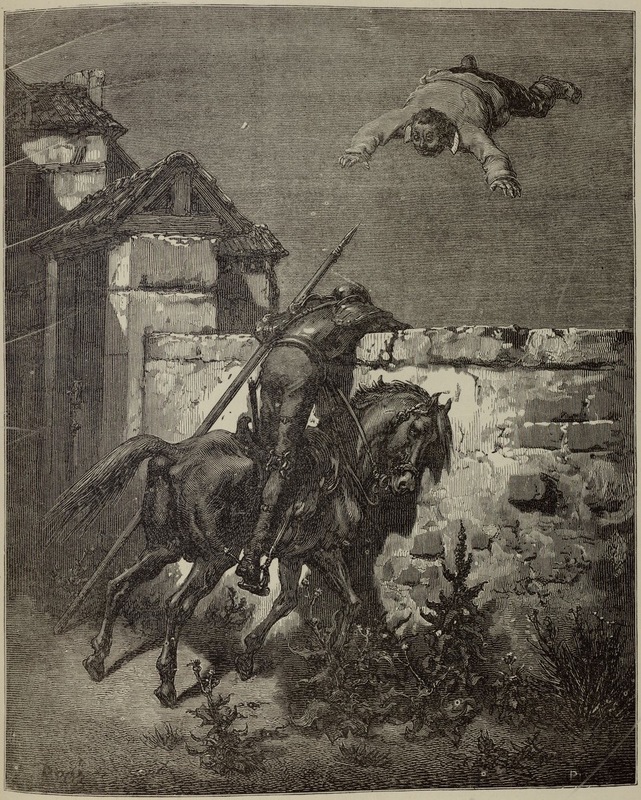 When Sancho Panza refuses to pay the innkeeper, guests at the inn toss him in a blanket in the courtyard and make merry with him. In the foreground, Don Quixote hears Sancho’s cries and watches from outside the walls of the corral. Signed by G. Doré (illustrator) and H.-J. Pisan (engraver). Part 1, ch. 17.