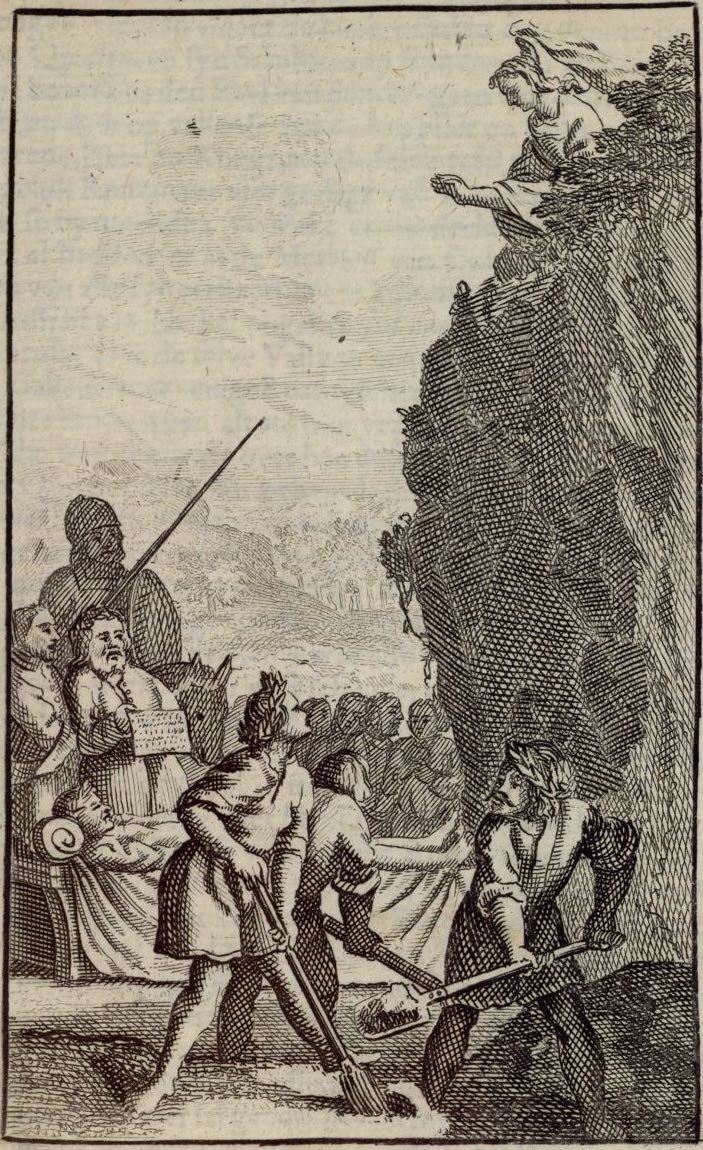 In the foreground, three shepherds dig Grisóstomo’s grave. In the background, Marcela makes her appearance and speech, while Vivaldo reads Grisóstomo’s song. Don Quixote, Ambrosio, and Grisóstomo’s body are also pictured. Unsigned. Part 1, ch. 14.