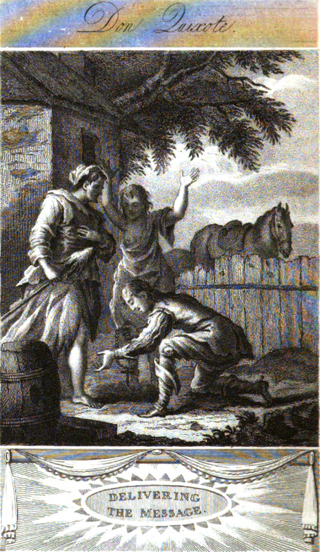 Sancho Panza's daughter meets the page sent by the Duke and the Duchess on behalf of Sancho Panza. Running to their house, Sancho's daughter (pictured in the middle with her hands raised in celebration) called for her mother. Her her mother, Teresa Panza (pictured on the left), came out, wearing a gray petticoat, a gray bodice also and loose smock sleeves. Upon meeting Teresa, the page went and kneeled before the lady Teresa with great respect. Then he pulled out of his pocket a string of corals, each bead set in gold and presented it to Teresa. In the background, the page's horse looks over the farm's fence at the ensuing events.