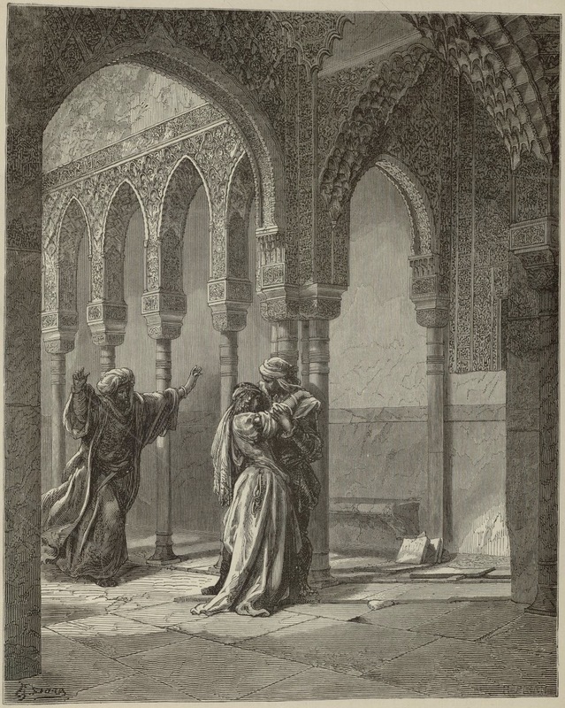 The illustration represents part of the captive’s tale: Zoraida pretends to faint when her father, Agi Morato, discovers her with the captive. Signed by G. Doré (illustrator) and H.-J. Pisan (engraver). Part 1, ch. 41.