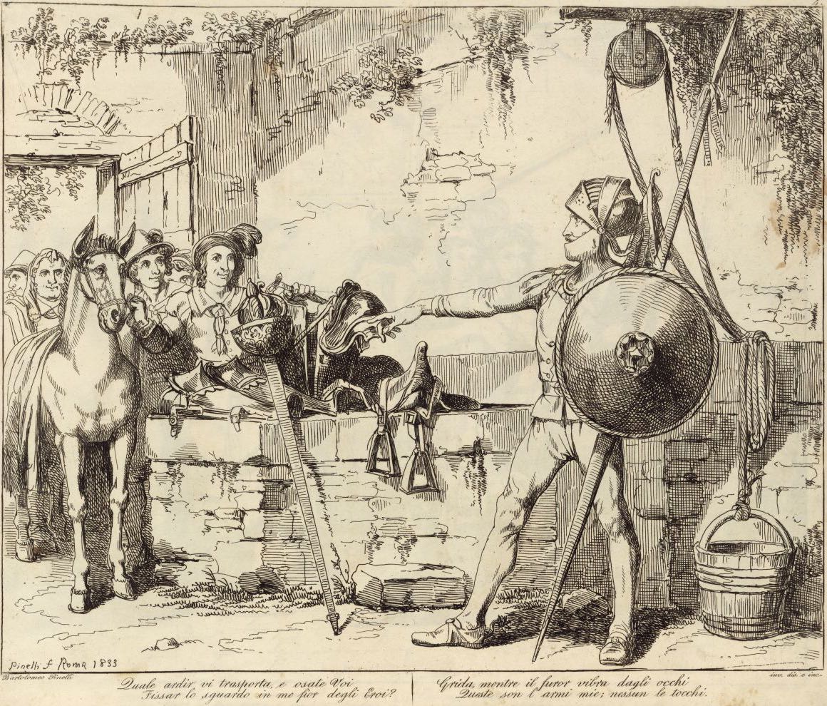 During his night vigil, Don Quixote orders the muleteers not to touch his arms, placed on a water trough next to a well. The scene is not accurate to Cervantes’ text: the first muleteer arrives alone in the text, while in the illustration they appear all at once. Signed by Bartolomeo Pinelli (engraver and illustrator) and dated Rome, 1833. Plate 4. Part 1, ch. 3.