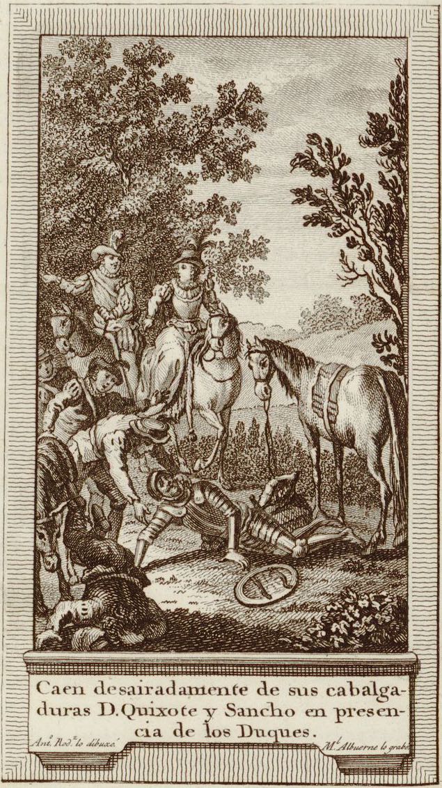 The duke and duchess’ servants help Don Quixote and Sancho Panza after falling to the ground from their mounts. Accurate to Cervantes’ text, the duchess is pictured on horseback, holding a goshawk. Signed by A. Rodríguez (illustrator) and M. Albuerne (engraver). Part 2, ch. 30.