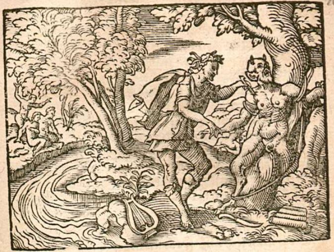This engraving illustrates the god Apollo (also known as Phoebus) skinning the satyr Marsyas alive. Apollo, being the god of music, was angered that Marsyas had challenged him to a flute playing contest. There is a reed flute on the ground beside Marsyas’ feet. After defeating Marsyas in the challenge, Apollo skinned him alive. Apollo is depicted cutting Marsyas on the shoulder. The river that flows beside the two figures is being formed by the tears of Marsyas.