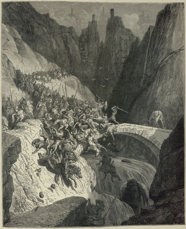 Un jour, s'étant placé a l'entrée d'un pont avec une épée a deux mains, il ferma le passage a toute une armée