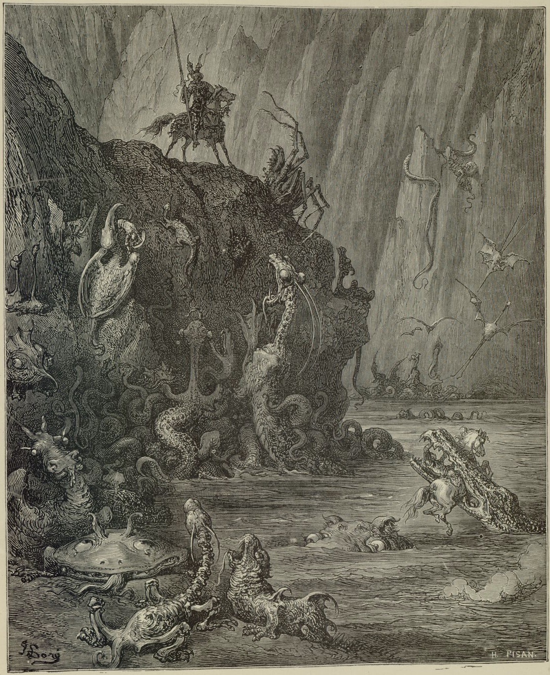 The illustration represents part of the tale of the Knight of the Lake, as told by Don Quixote to the canon of Toledo in defense of chivalric novels: the Knight arrives at a great lake of boiling pitch in which swim snakes, serpents, lizards, and all manner of other fierce and fearsome creatures. Signed by G. Doré (illustrator) and H.-J. Pisan (engraver). Part 1, ch. 50.